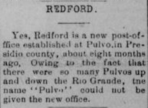 Redford was founded about 1876 as El Polvo and was a major trade center in the region for it's time. It's orignal roots go back thousands of years to the indigenous people who lived here and depended on the river as well as a river crossing nearby. Farming may go back to 1500BC in the area and continues to this day, mostly in Mexico.There was an active church, a cavalry post now in ruins and several other buildings. A nice article is written in Legends of America about the area.
